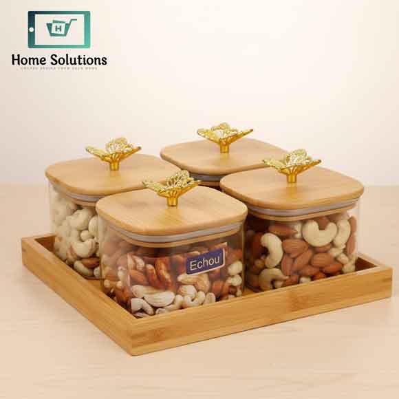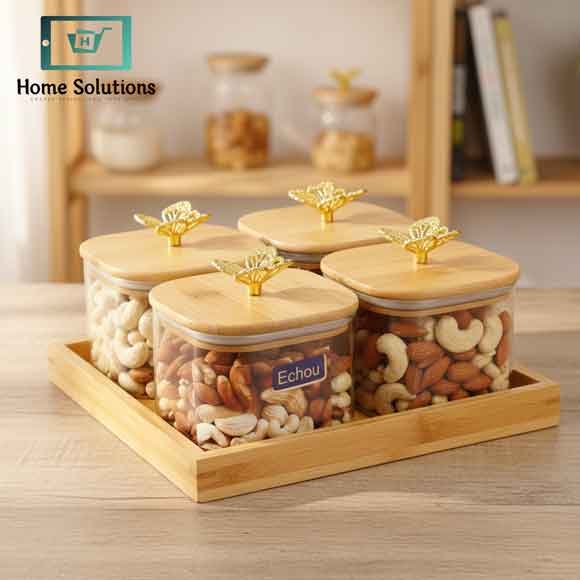 Bring elegance and organization to your kitchen with this 4 Pcs Butterfly Glass Jar Set with Wooden Tray, exclusively available at HomeSolution.pk. Each jar is made from high borosilicate clear glass with airtight bamboo lids that keep your dry fruits and snacks fresh for longer.
