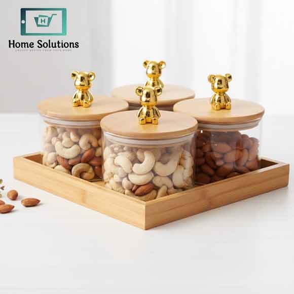 Add luxury and charm to your kitchen with this 4 Pcs Gold Bear Glass Jar Set with Wooden Tray, exclusively available at HomeSolution.pk. Each jar is made from high borosilicate glass, ensuring strength, clarity, and safety for storing your favorite dry fruits, snacks, or coffee beans.