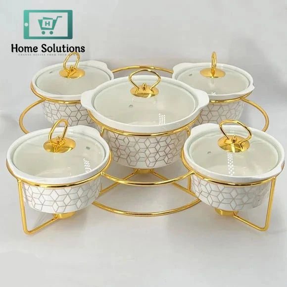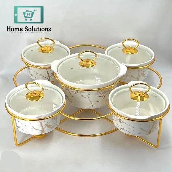 5-Piece Round Ceramic Chafing Dish Set – Marble Finish Warmers