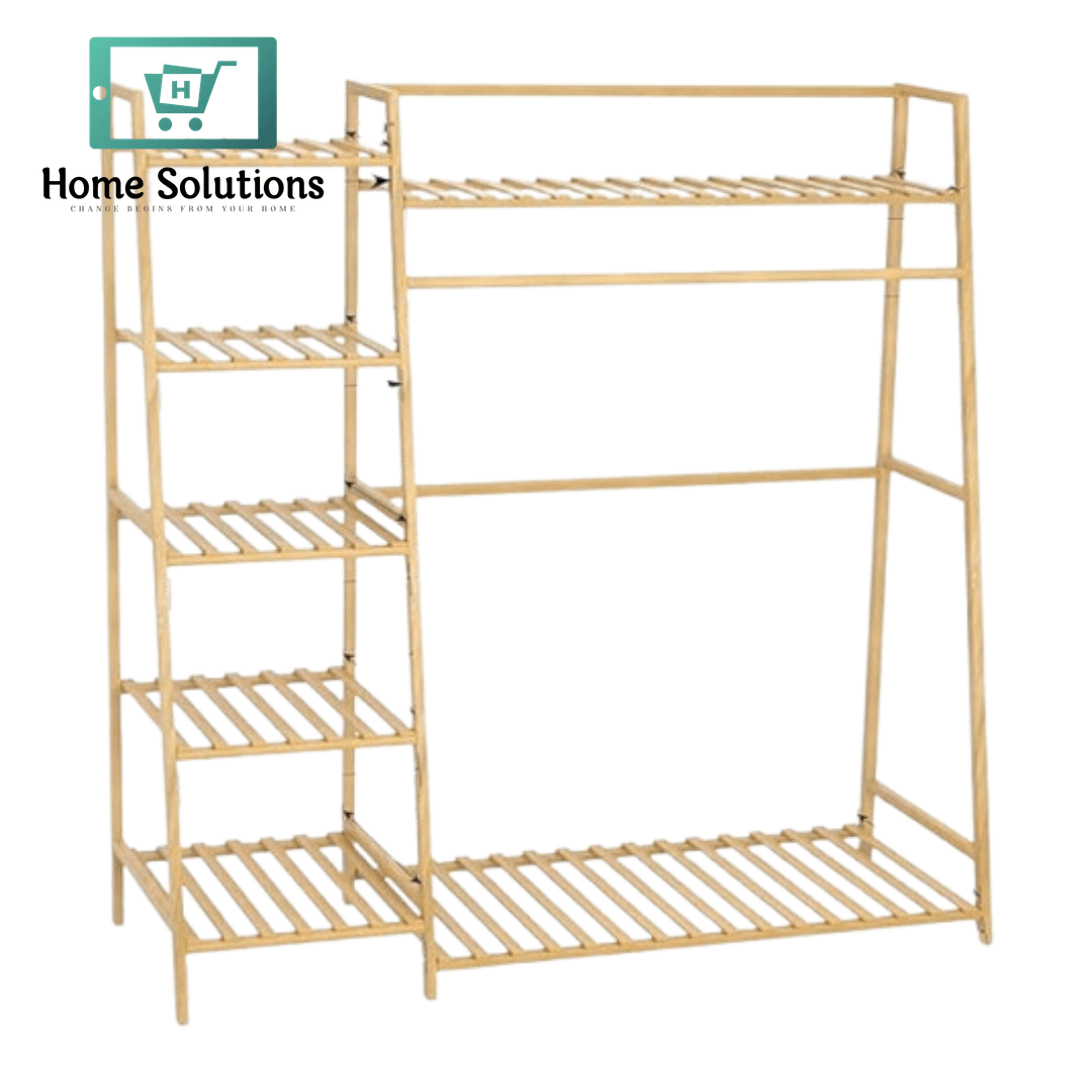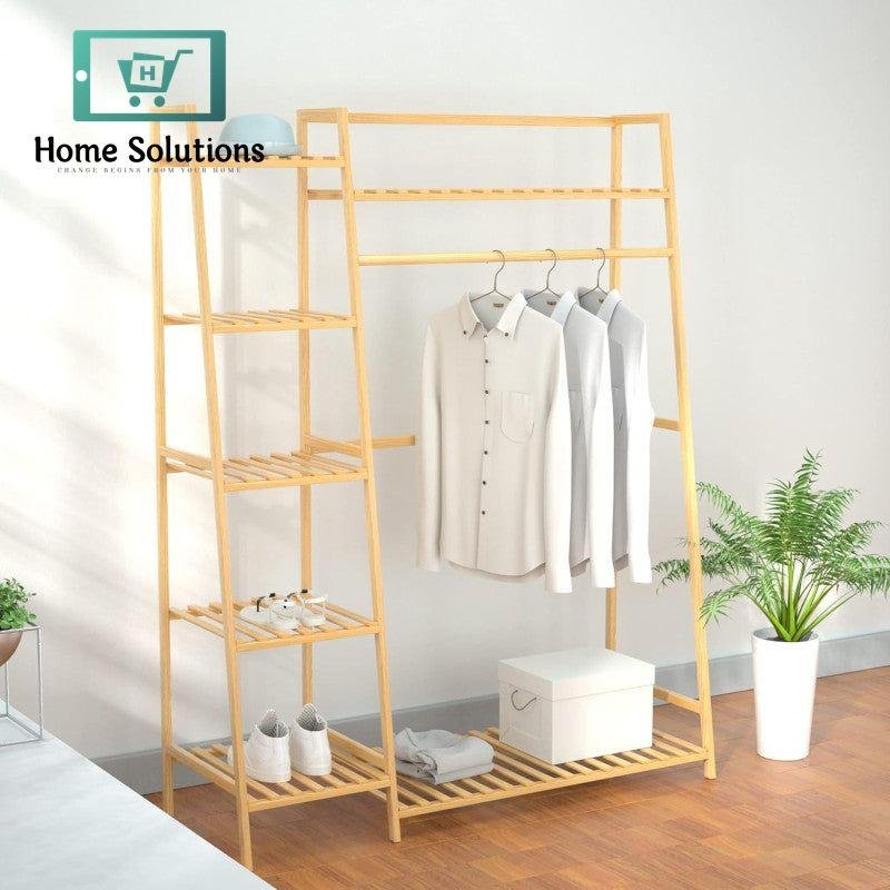 - This multifunctional coat hanger is equipped with 1 top shelf,1 hanging rod,1 bottom shelf, 5-tier storage shelf to give you more storage options! Top hollow shelf, expand the storage area, make full use of space. Top rod provides sufficient space to hang any long pants, overcoats and dresses without wrinkles. Widen and thicken bottom shelf is convenient to organize shoes, box, suitcases, 5 tires storage shelves are handy for keeping hats, handbags, towels, get rid of confusion