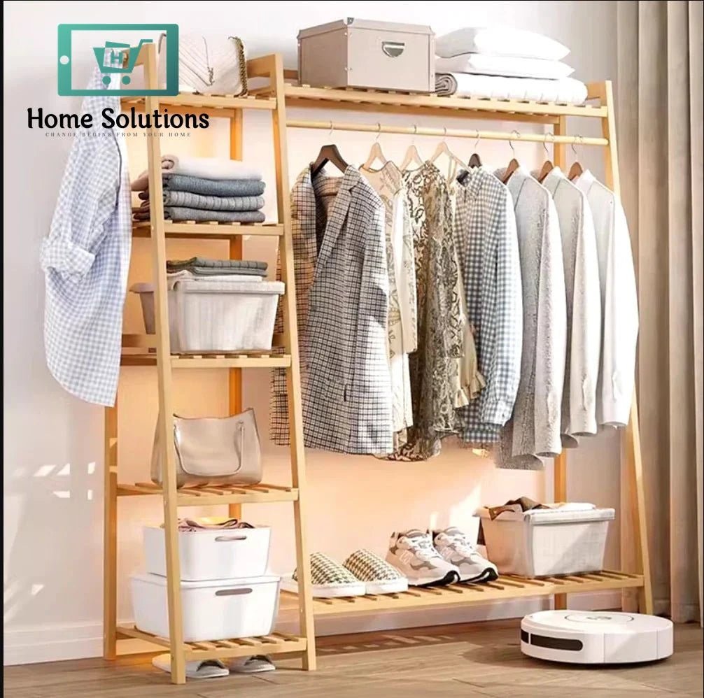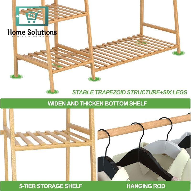 - The 5-tier garment rack is made of 5 years bamboo in high mountains, which is eco-friendly and 100% safe for you and your family, With adsorption capacity, this bamboo hanging rack can be used as a house purifier. It is durable after whole board processing and high-temperature carbonization, avoids the problems of rusting, Deformation, hollow and unstable of iron clothes hanger.