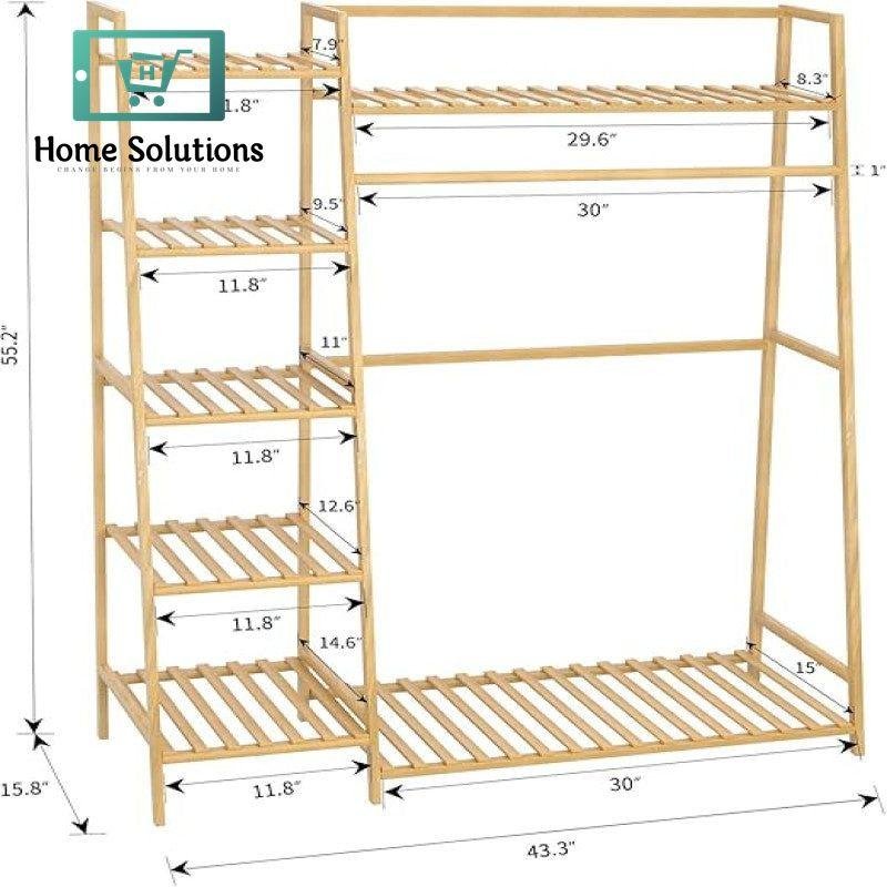- The garment hanger rack with shelf measures at H55.2″ x W43.3″ x D15.8″,offers you plenty of space to keep all the stuffs organized, meet various seasons requirement! Stable trapezoid structure enable this bamboo rack strong bearing capacity up to 100lbs!Hanger rod has been thicken to hang a lot of jackets and sweaters, winter coats without worrying about deformation! Thicken slats and back support are added on the main frame to highly increase the stability of clothes rack