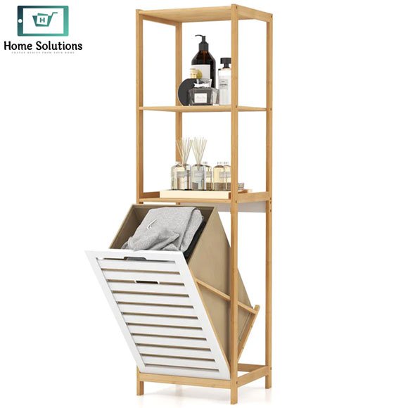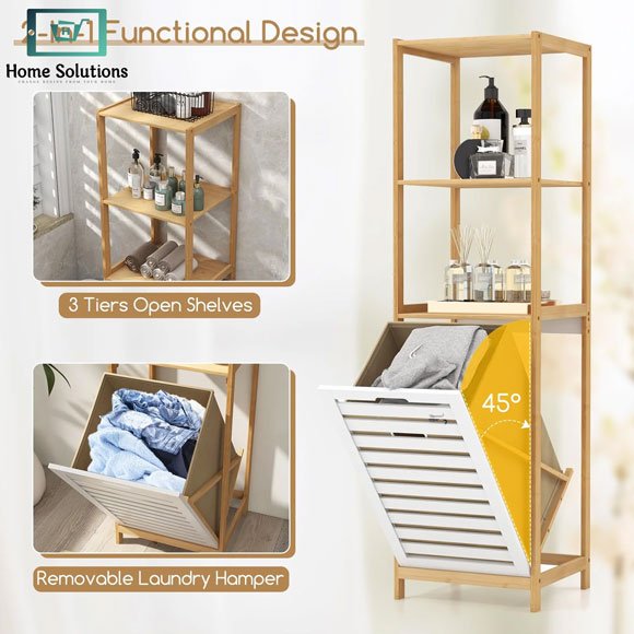 The Bamboo Laundry Basket with 3-Tier Storage Shelves combines practicality and elegance for modern homes. Its tilt-out front with a slatted design keeps dirty laundry hidden while allowing airflow to keep clothes fresh.