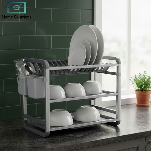 Its dual-tier design maximizes vertical space, making it ideal for modern kitchens with limited counter area. The top tier is perfect for plates, cutting boards, and trays, while the bottom tier comfortably holds bowls, mugs, and larger utensils.