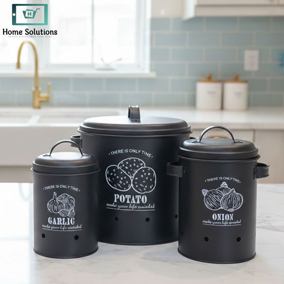 Premium Metal Potato Onion Garlic Canister Set – Black (3pcs)