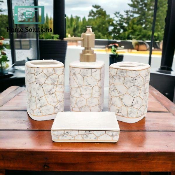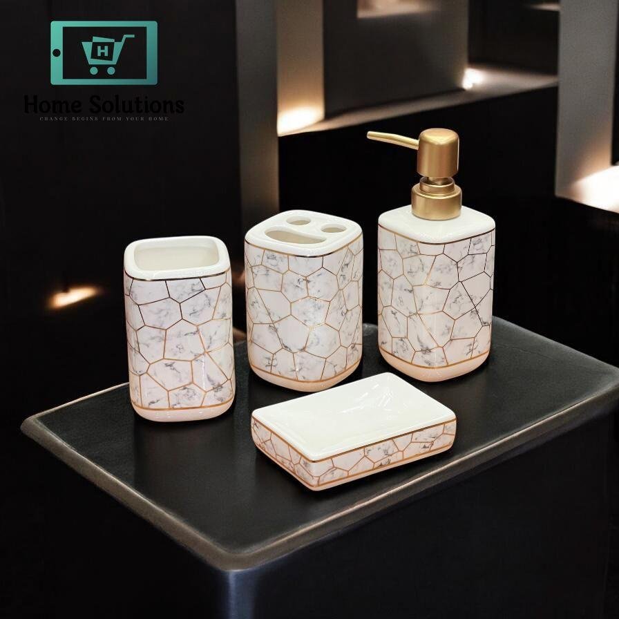 Upgrade your bathroom with this elegant 4-piece ceramic accessory set. Designed with a modern touch, it includes a soap dispenser, toothbrush holder, tumbler, and soap dish. Durable and easy to maintain, this set blends practicality with style, keeping your bathroom organized while adding a luxurious accent to your décor.