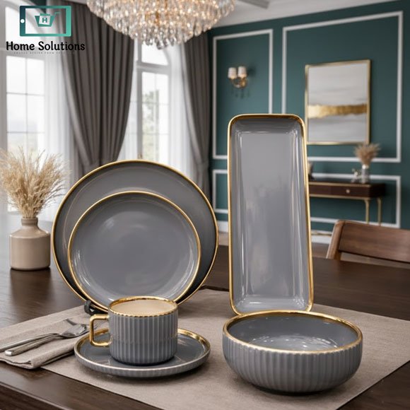 Ceramic Dinner Set Grey – 32 Pieces Luxury Tableware with Gold Rim