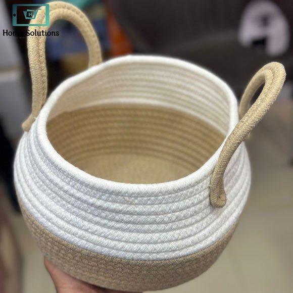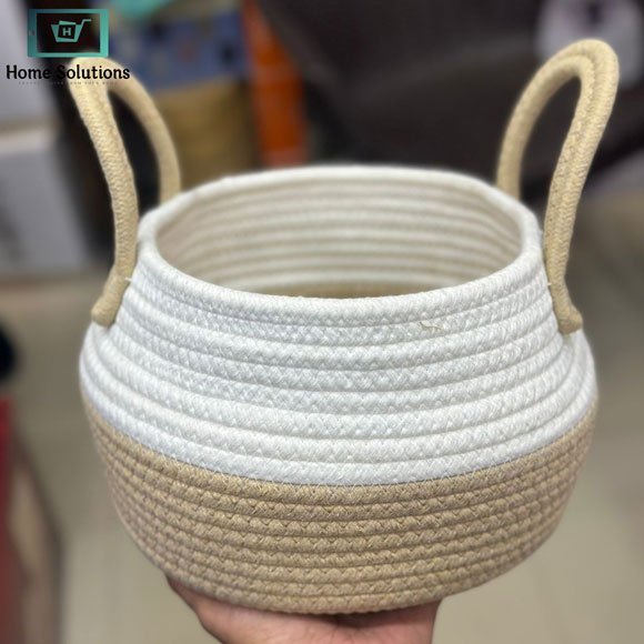 Cotton Rope Woven Storage Basket – Beige & White with Handle