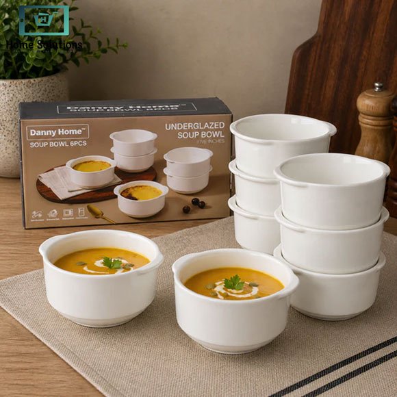 Danny Home Ceramic Bowl Set 6pcs – White Serving Bowls with Handles for Soup & Snacks