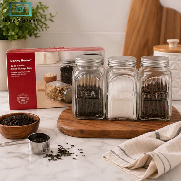 Danny Home 3pcs 1000ml glass jar set with metal lids. Airtight containers perfect for kitchen storage & pantry organization.