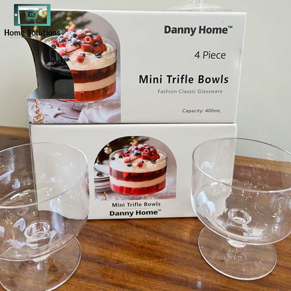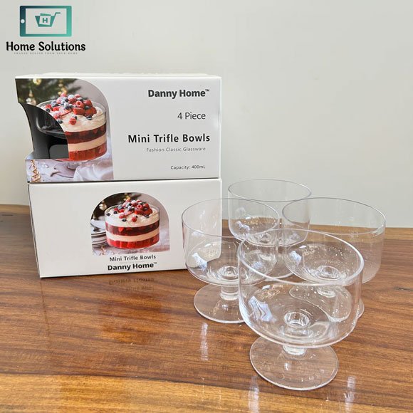 Upgrade your kitchen serveware with the elegant Danny Home Mini Trifle Bowl 4‑pcs Set. Each bowl holds 400 ml, ideal for serving individual desserts, fruit salads, puddings, snacks or parfaits. Made from durable, clear glass, these bowls showcase colorful layers beautifully — perfect for trifles, ice cream, custards or fruit salads during family dinners, parties or festive gatherings. They are food-safe, dishwasher‑safe, and stackable, offering both style and convenience for everyday use or special occasions. This compact 4-piece set combines practicality with sophistication, enhancing your dining experience at home.