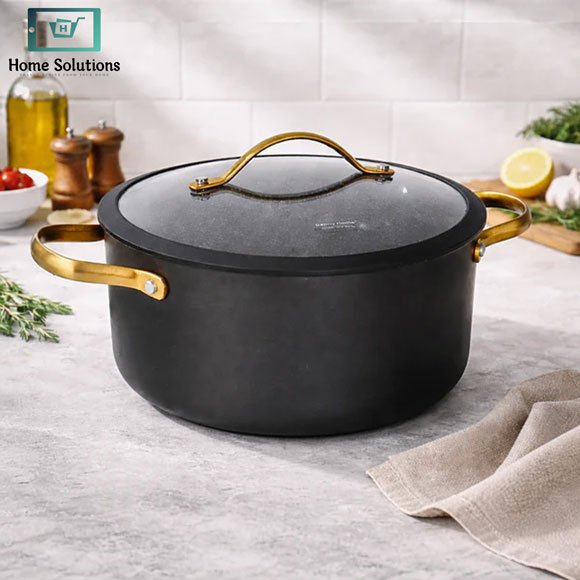 22cm non-stick casserole pot with lid. Durable black finish with gold handles, perfect for easy and stylish everyday cooking.