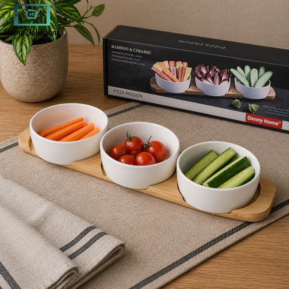Danny Home bamboo ceramic serving platter set tray with 3 bowls snack dip serving set modern kitchen serveware
