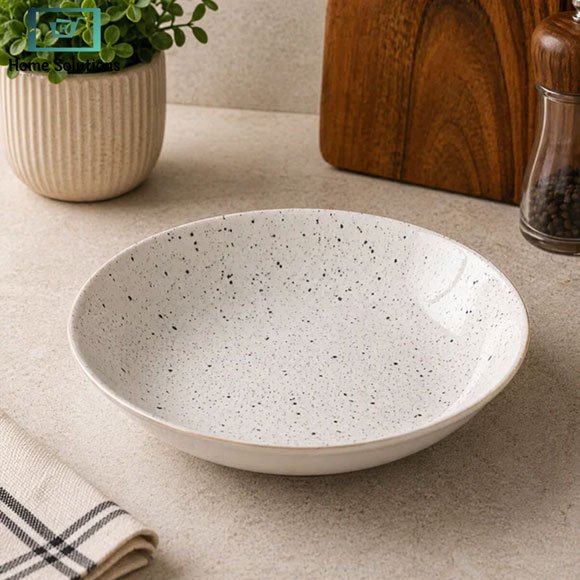 Danny Home speckled deep plate 8 inch with golden rim. Perfect for pasta, soups and hearty meals. Elegant and stylish design.