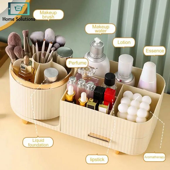 Organize your beauty essentials effortlessly with this Desktop Makeup Organizer with Drawers, designed to bring both convenience and elegance to your daily routine. This multifunctional storage box features a smart combination of open compartments and smooth sliding drawers, allowing you to neatly arrange your makeup, brushes, skincare products, and accessories in one place.