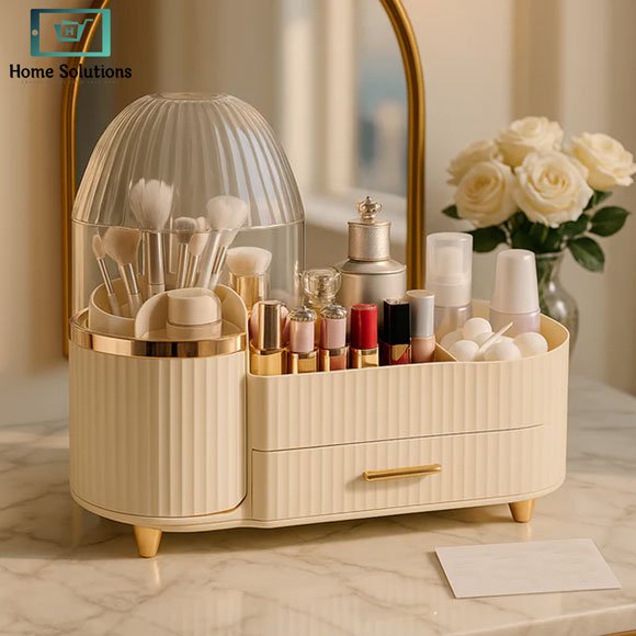 The upper section is perfect for storing frequently used items such as makeup brushes, lipsticks, foundations, perfumes, and skincare bottles, keeping them visible and easy to access. The lower drawers provide additional hidden storage for smaller items like jewelry, eyeliners, palettes, and personal accessories, helping you maintain a clean and clutter-free space.