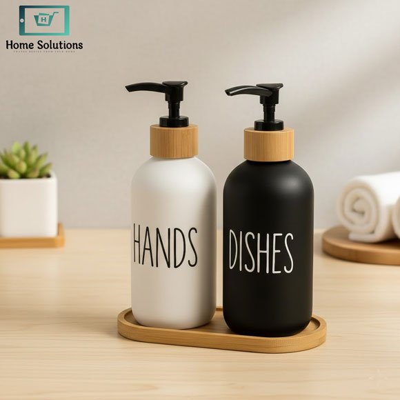 Minimalist dual soap dispenser set with frosted glass bottles and bamboo tray. Refillable, stylish, and perfect for hands & dishes.