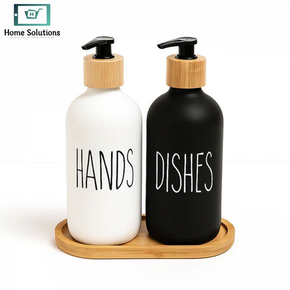 Dual Soap Dispenser with Bamboo Tray – Frosted Glass Hands & Dishes Set
