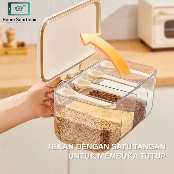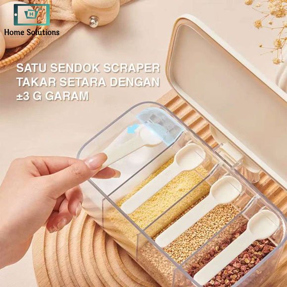 Designed with an elegant and minimalist look, its white and cream color combination perfectly complements modern kitchens. Each compartment is equipped with a spill-resistant lid and built-in measuring spoon, ensuring clean usage, accurate seasoning, and mess-free cooking.