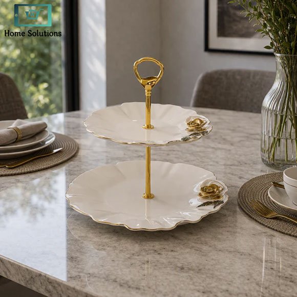 Elegant 2-tier ceramic cupcake stand with floral design and gold handle — perfect for serving desserts, cakes, and snacks in style.