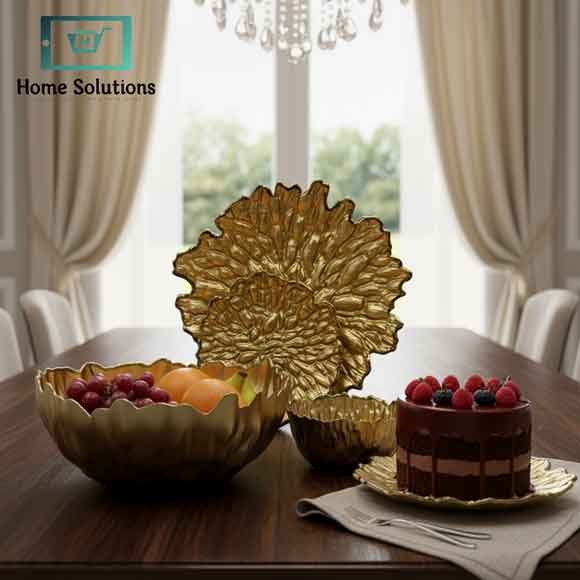 Add a touch of timeless elegance to your dining with this Luxury Gold Leaf Textured Fruit and Cake Serving Set (14 Pieces). Designed to impress, this premium set features a stunning gold leaf texture with a glossy finish — perfect for showcasing fruits bowl, cakes, or desserts in style.