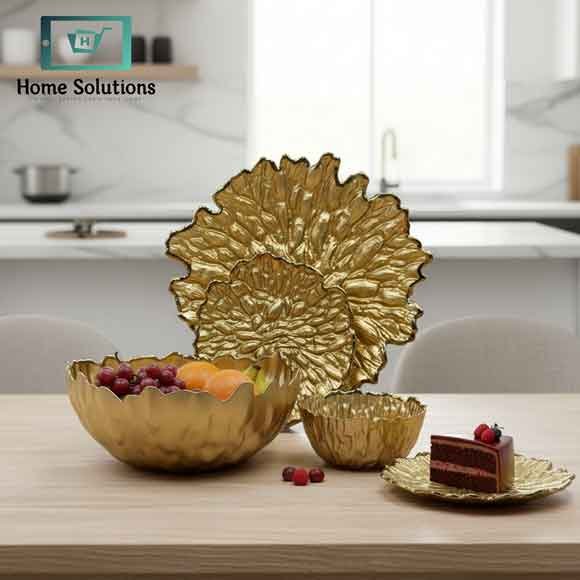 Elegant Gold Leaf Textured Fruit Bowl & Cake Serving Set 14 Pcs – Gold