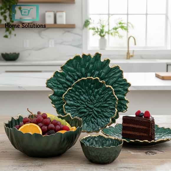 Elegant Gold Leaf Textured Fruit Bowl & Cake Serving Set 14 Pcs – Green & Gold