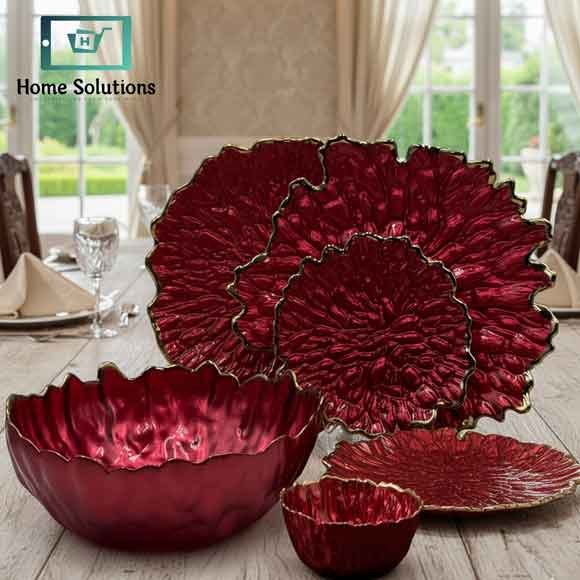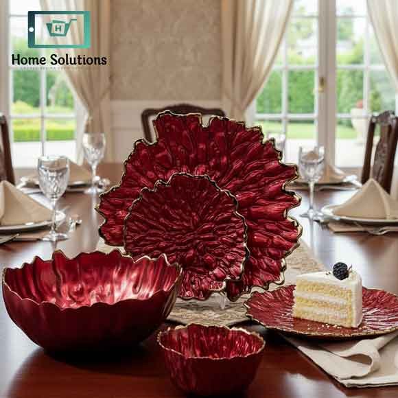 Elegant Gold Leaf Textured Fruit Bowl & Cake Serving Set 14 Pcs – Red and Gold
