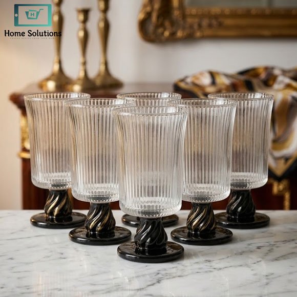 Elegant ribbed glass set of 6 with black base. Stylish fluted design perfect for juice, cocktails & modern table presentation.