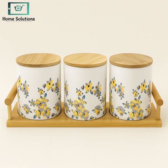Floral Ceramic Jar Set of 3 – Yellow & Gray with Bamboo Tray