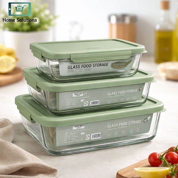 Glass food storage box set 3pcs with airtight lids. Perfect for meal prep, leftovers, fridge storage & kitchen organization.