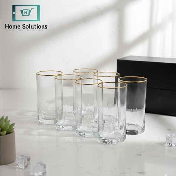 Elegant 6-piece tumbler glass set with gold rims and modern tapered design. Perfect for daily use, serving, and gifting. Durable, stylish, and timeless.