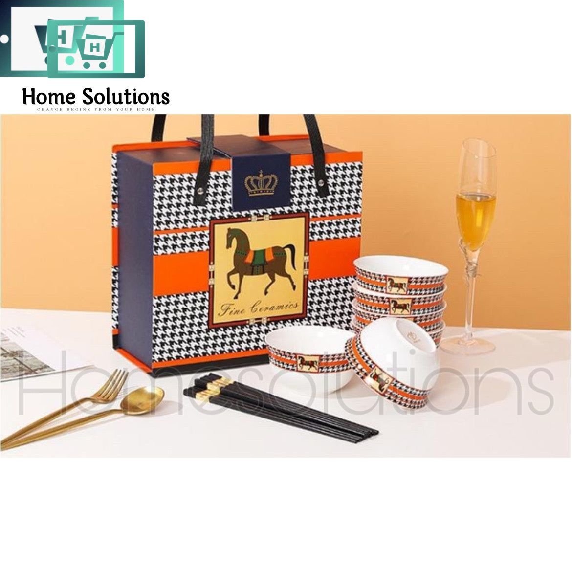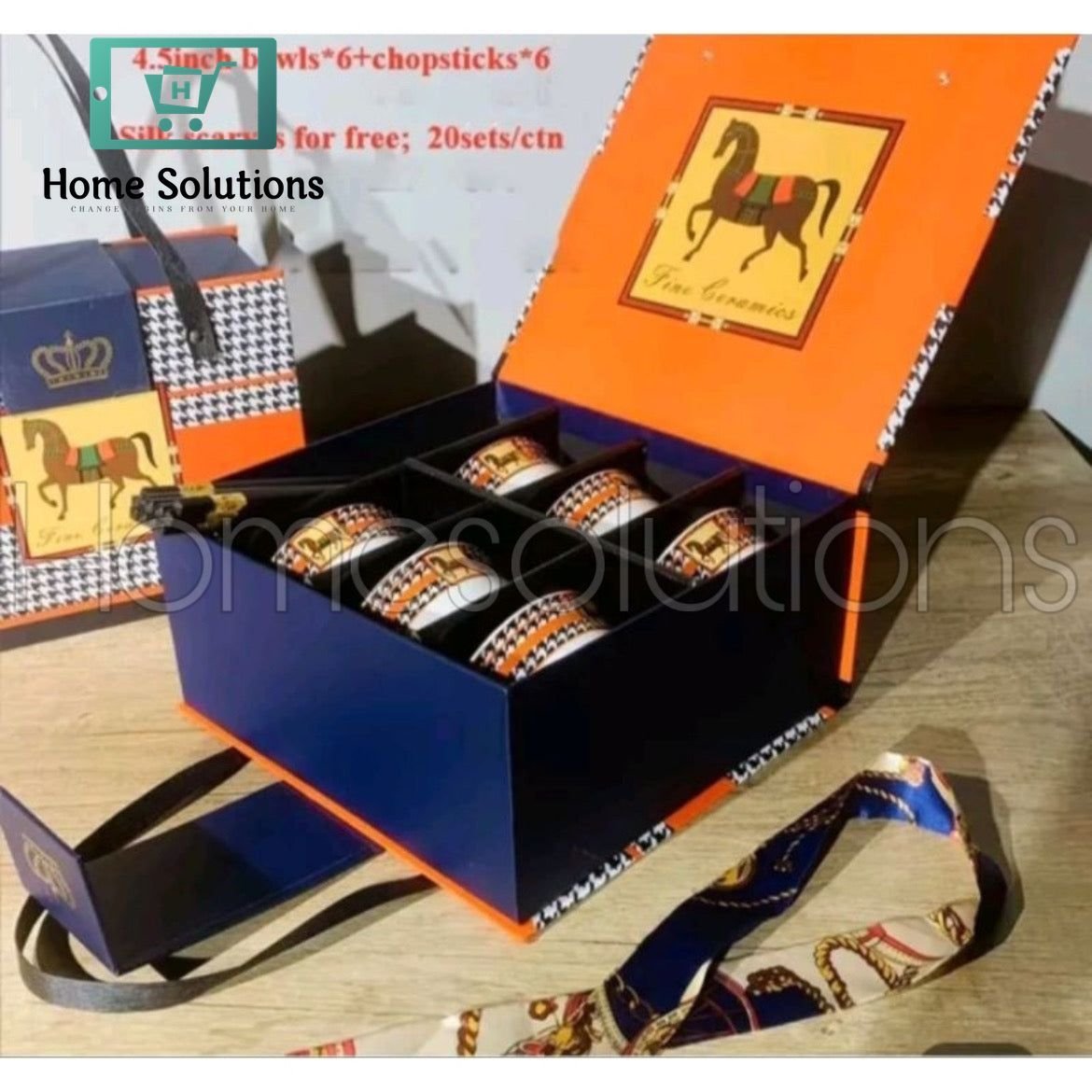 Horse Motif 6 Pieces Luxury Chinese Bowls with Chopsticks & Gift Box