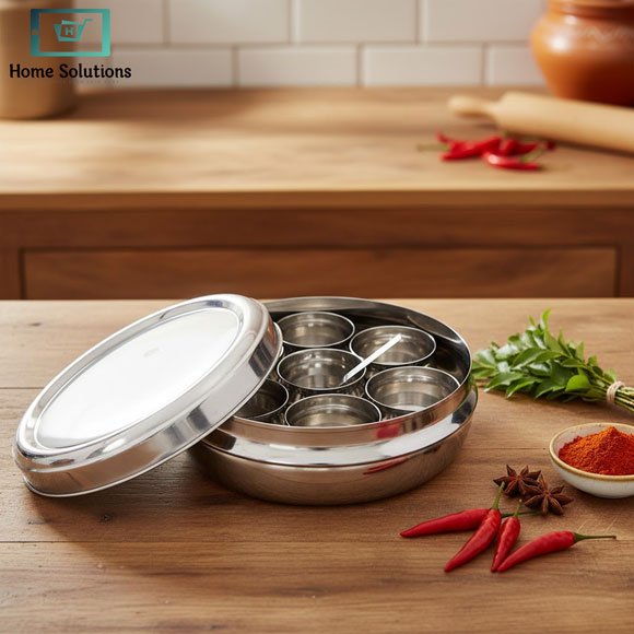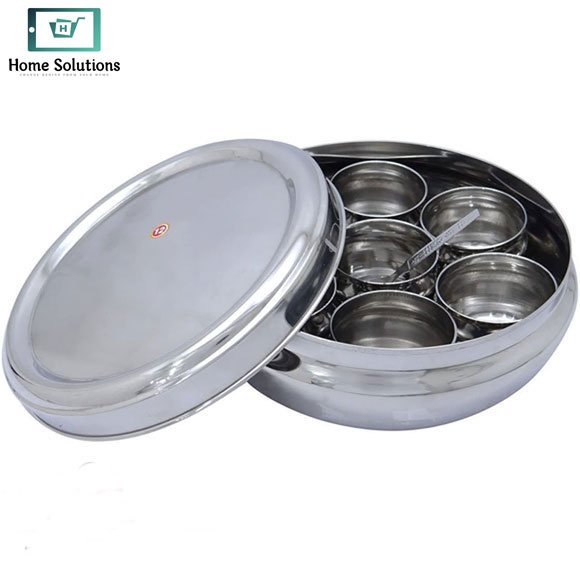 The classic silver-tone finish gives it a timeless look, while the sturdy construction helps maintain freshness and aroma of spices. Compact yet spacious, this masala box is ideal for storing turmeric, red chili, cumin, coriander, garam masala, and other frequently used spices.