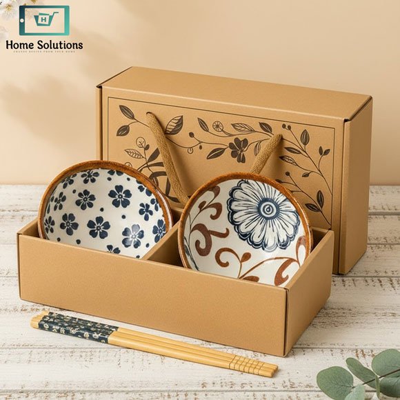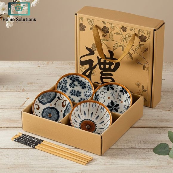 Elegant Japanese style ceramic bowls with matching chopsticks. Durable, glossy finish and perfect for rice, noodles and soups.