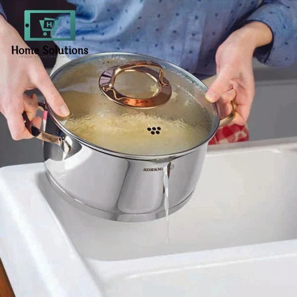 The pot allows to cook and drain ingredients thanks to its unique lid draining function - COOKWARE SET: Stainless steel cookware set has 4 pots : Pot: 16x8cm / 1.6 lt / 1,69 Quart Pot: 20×10 cm / 3.0 lt / 3,17 Quart Pot: 24×12 cm / 5.5 lt / 5,81 Quart Pot: 24×7 cm / 3.0 lt / 3,17 Quarts.