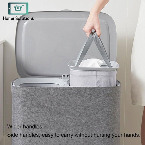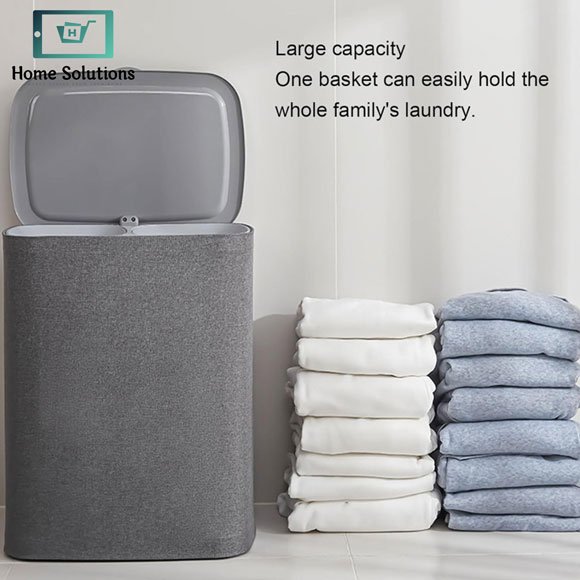 A durable Laundry Basket with Lid featuring dual compartments for easy sorting. Ideal for bathrooms and home use, offering clean, organized, and covered laundry storage.