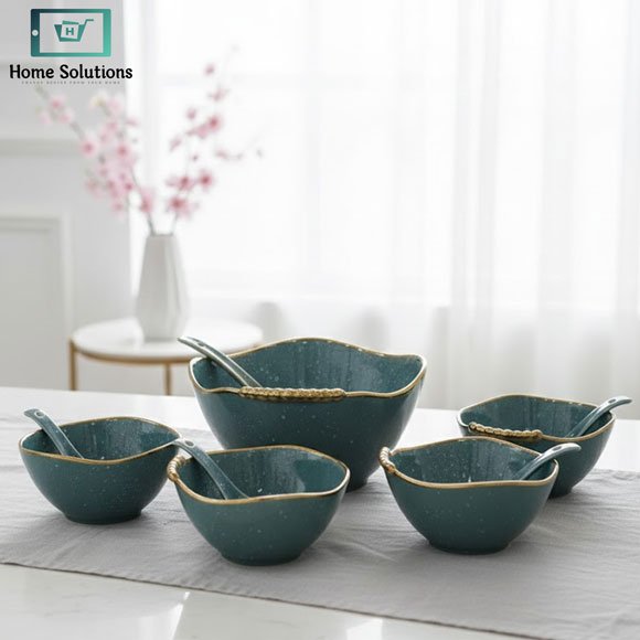 Luxury 14-Piece Ceramic Soup Set with Gold Trim Serving Bowls & Spoons – Dark Teal