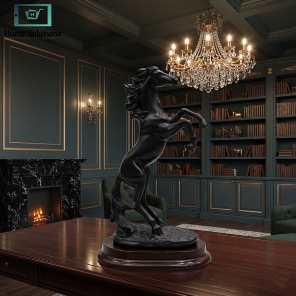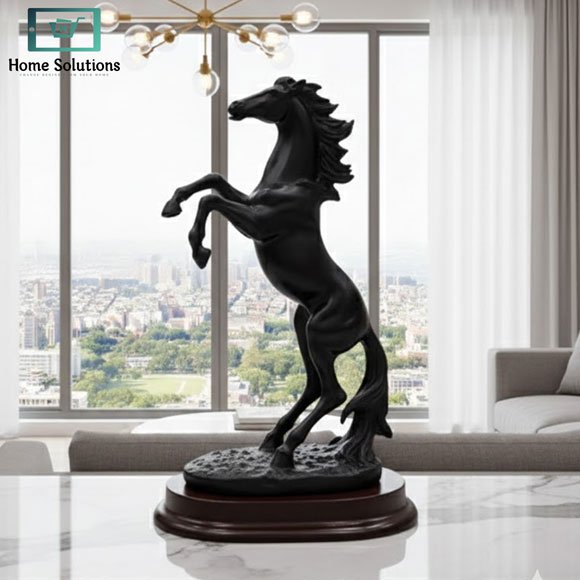 Elegant black rearing horse sculpture with wooden base. A compact yet striking décor piece for luxury home and office spaces.