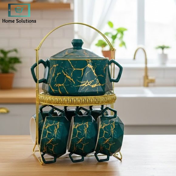 Elevate your dining table with this 15-piece green marble geometric soup set, featuring a luxurious golden arch rack stand. Perfect for soups, stews, and elegant serving.