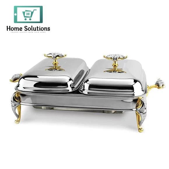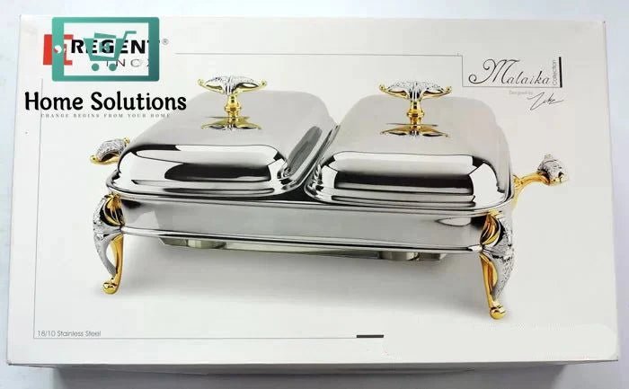 Enhance your buffet presentation with the Malaika twin warmer set, featuring two 1.5 litre oven-safe glass dishes nestled within elegant stainless steel cradles. Crafted from premium 18/10 stainless steel, each rectangular warmer includes a fitted lid and polished handles for easy lifting. Perfect for serving hot casseroles, gravies, vegetables, or sauces, this dual-warmer maintains food temperature while enhancing table aesthetics
