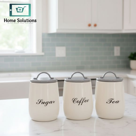 Organize your kitchen in style with this premium Metal Jar Set – Coffee, Tea, Sugar (3 Pieces) featuring a sleek cream-white finish and classic Gray lids.