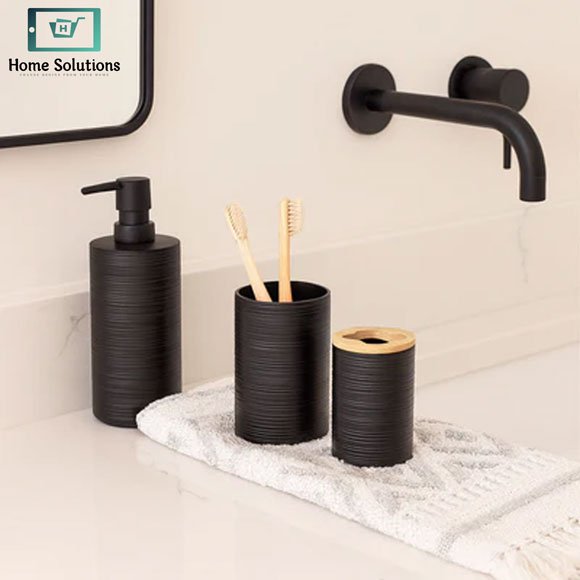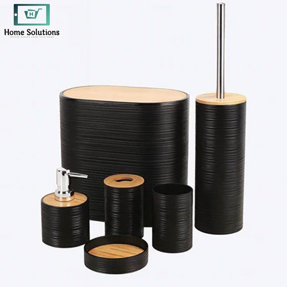 Add elegance and smart organization to your bathroom with this Modern Black 6-Piece Bathroom Accessories Set. Featuring a matte black ribbed texture paired with natural bamboo accents, this premium set delivers a luxurious and contemporary look — perfect for modern Pakistani homes.