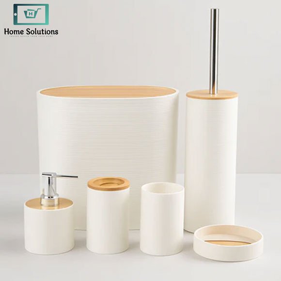 Add elegance and smart organization to your bathroom with this Modern White 6-Piece Bathroom Accessories Set. Featuring a matte White ribbed texture paired with natural bamboo accents, this premium set delivers a luxurious and contemporary look — perfect for modern Pakistani homes.