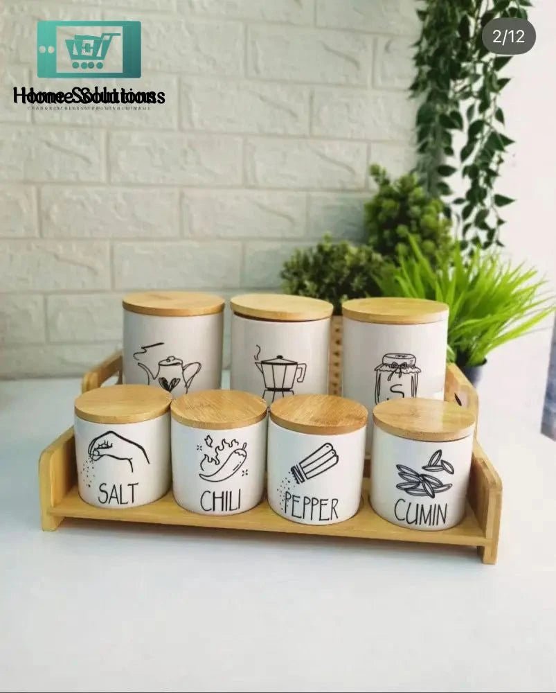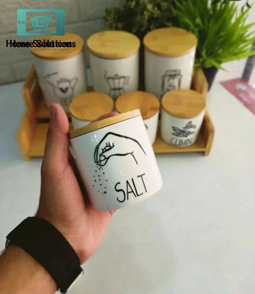7pcs porcelain condiments storage airtight jars with real bamboo wood stand.