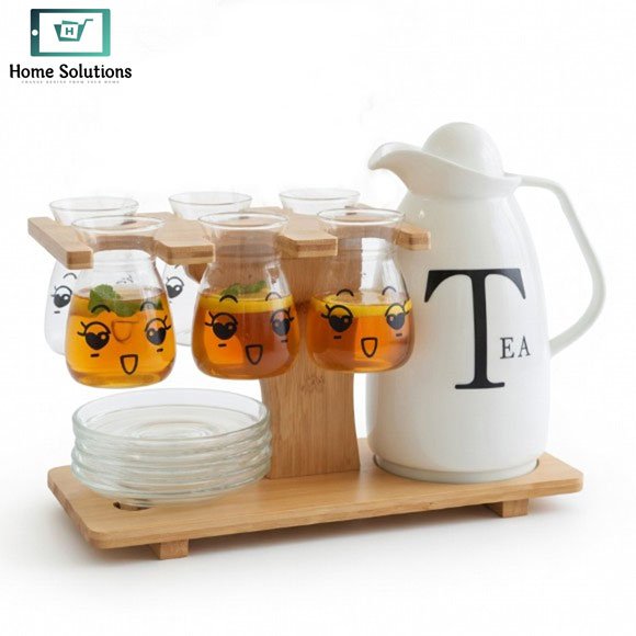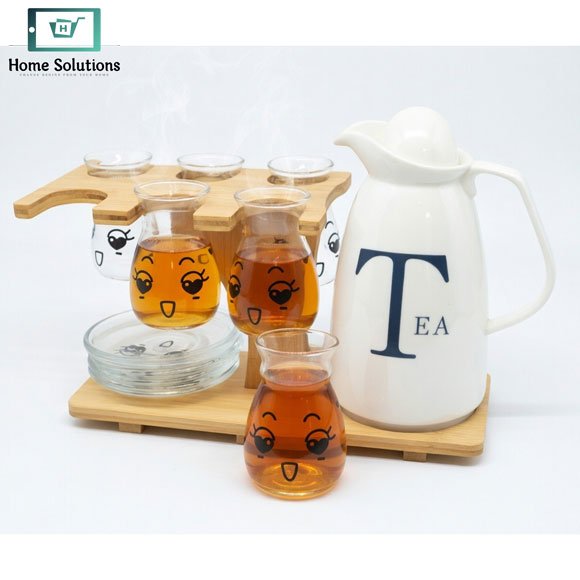 15-piece tea set with porcelain teapot, emoji glass cups, saucers and bamboo stand. Perfect for serving tea in style.