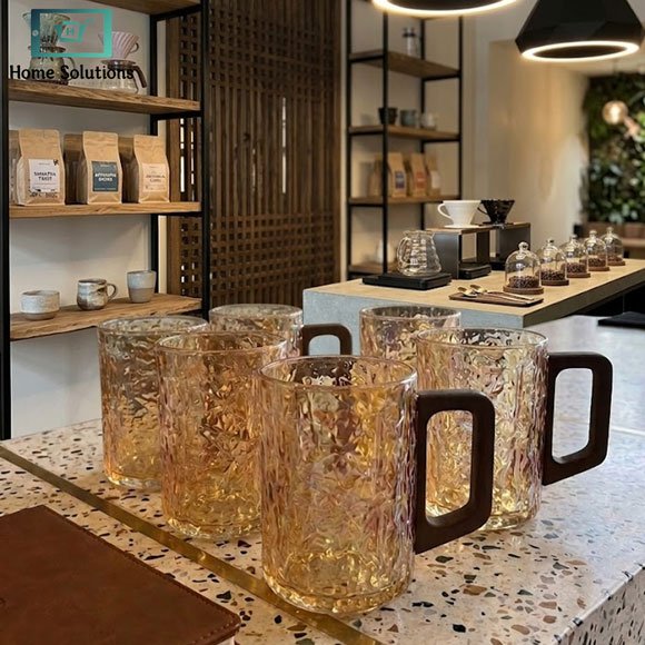 Stylish ripple glass mug with wooden handle, heat-resistant and perfect for coffee, tea, and everyday use. Durable & aesthetic design.