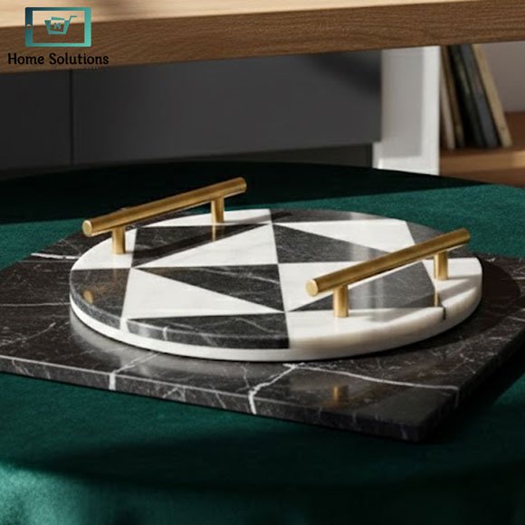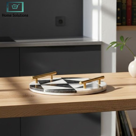 Add elegance to your home with this Black & White Geometric Round Marble Tray featuring modern gold handles. Perfect for serving, décor, candles, perfumes, and kitchen styling.