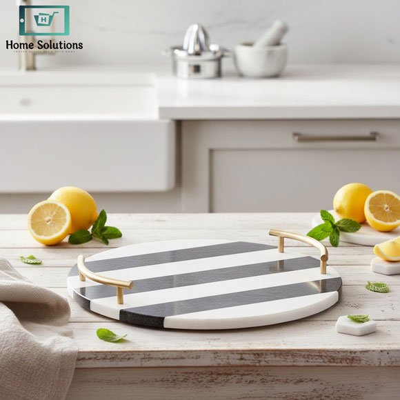 Upgrade your home décor with the Black & White Striped Round Marble Tray with Gold Handles, a stunning statement piece designed to combine modern style with timeless luxury. Crafted from high-quality natural marble, this tray features an eye-catching black and white striped pattern that instantly elevates any space—whether it’s your kitchen, dining table, living room, bathroom countertop, or vanity.