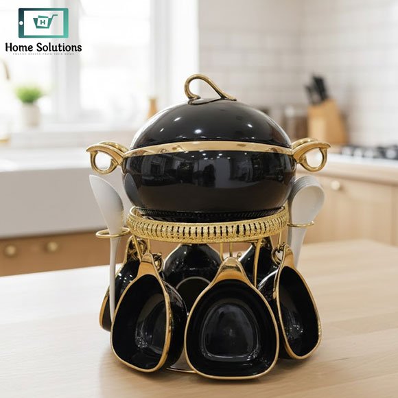 This complete set includes 16 pieces — perfectly sized soup bowls and matching ceramic spoons — along with a beautifully designed golden stand for organized, stylish display. The stand not only keeps your bowls neatly arranged but also adds a decorative flair to your dining table or kitchen décor.